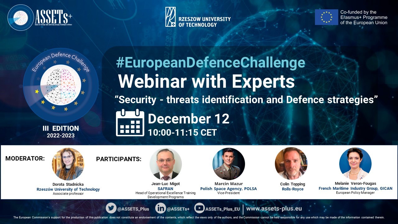 This webinar marks the beginning of the second phase of the III edition of European Defence Challenge (EDC), a key part of the ASSETs+ project, that aims to atract young talents and to encourage them to initiate a career in defence-related technologies.